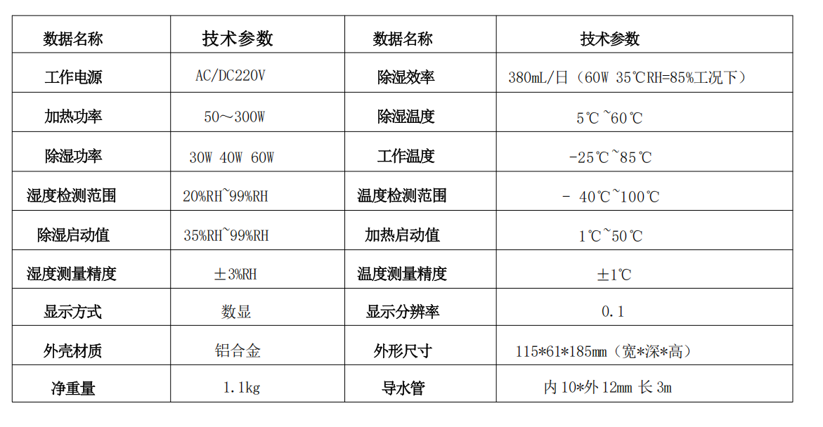 快;自动运行与手动除湿功能切换、除湿启动值和湿度断开值可调;采用先进存储技术,实现掉电后设 定参数仍能保存;